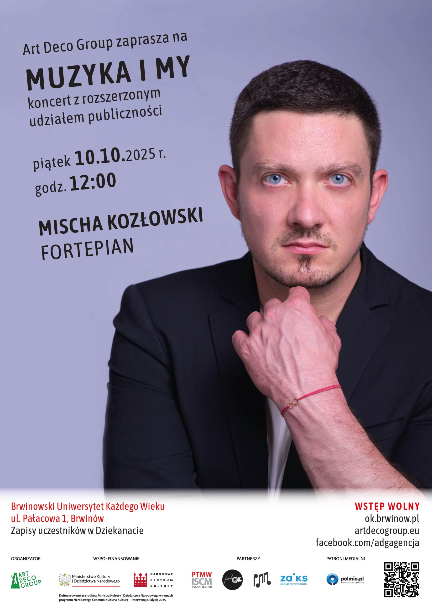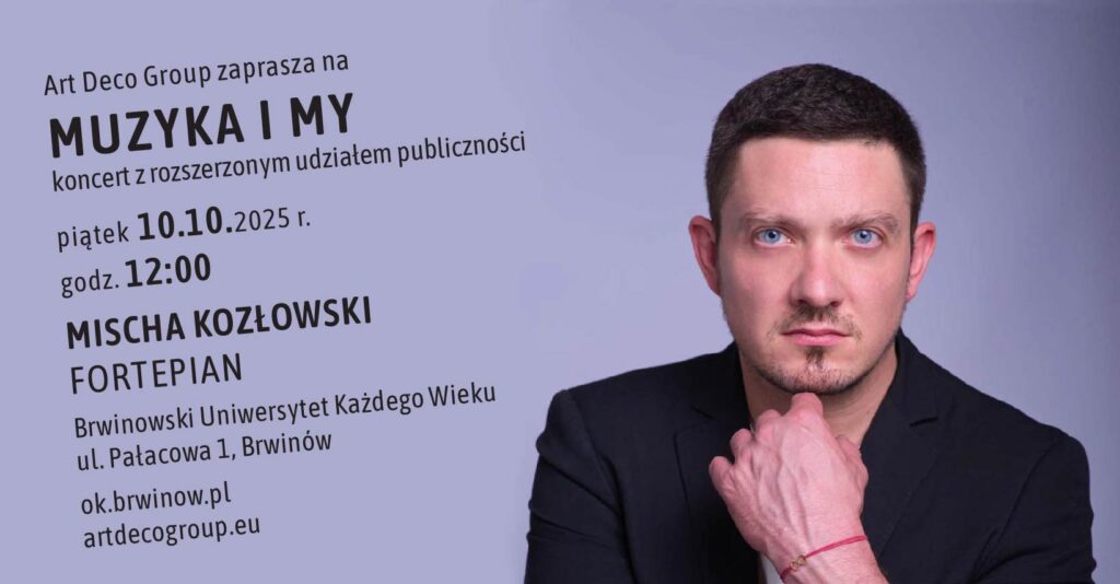 W piątek 10 października w Brwinowskim Uniwersytecie Każdego Wieku (ul. Pałacowa 1, Brwinów), wystąpi świetny pianista Mischa Kozłowski, który wykona i omówi wybrane przez siebie utwory kompozytorów polskich i zagranicznych.